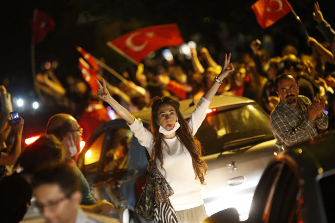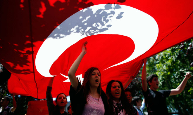 وتدفق المتظاهرون بالالاف الى ساحة تقسيم مجددا رافعين الاعلام التركية وهاتفين "طيب ارحل".