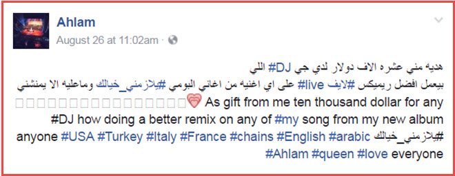 وكتبت أحلام عبر صفحتها الرسمية على موقع "فيسبوك”: "هدية مني عشرة آلاف دولار لدي جي DJ اللي بيعمل أفضل ريميكس لايف live على أي أغنية من أغاني ألبومي (يلازمني خيالك) وما عليه إلا يمنشني”.
